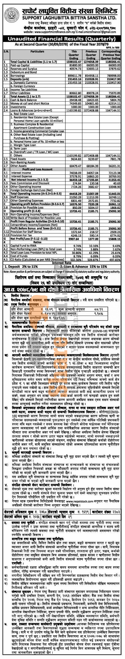 Support Laghubitta Bittiya Sanstha Limited has posted a net profit of Rs 9.9 million and published its 2nd quarter company analysis of the fiscal year 2078/79.