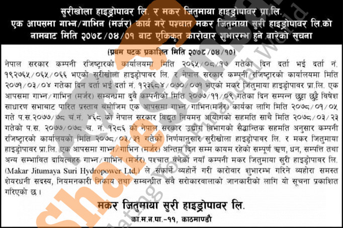 Surikhola Hydropower Limited and Makar Jitumaya Hydropower Limited after the successful merger to commence its joint transactions in the name of Makar Jitumaya Suri Hydropower Limited Limited from 1st Shrawan, 2078.