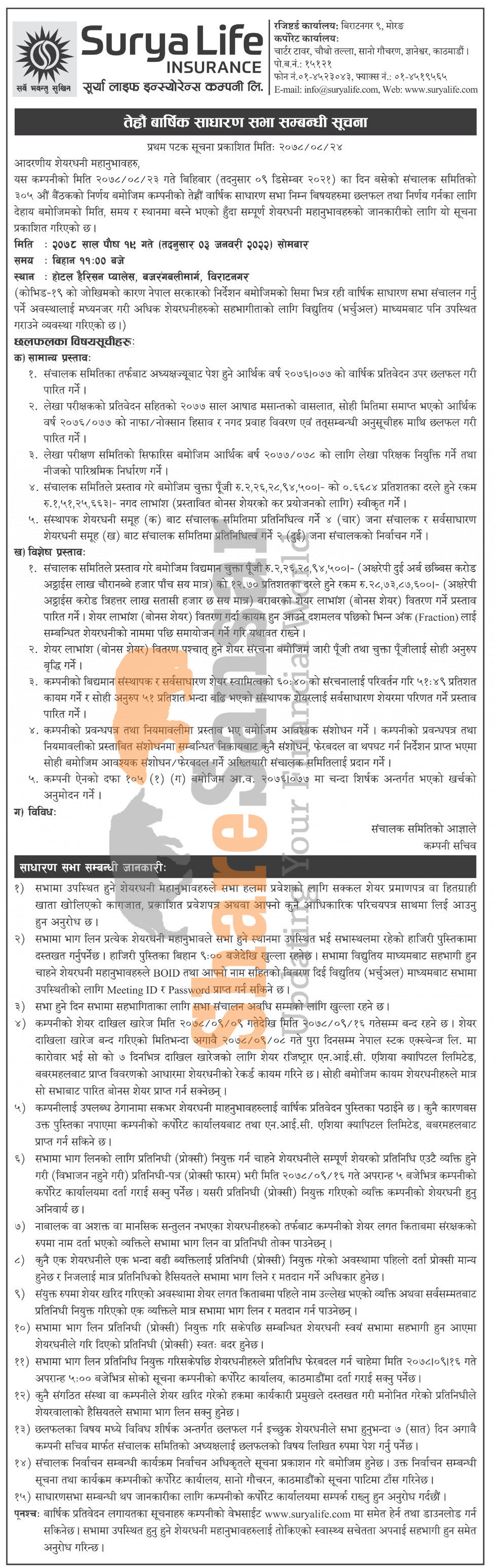 Surya Life Insurance Company Limited has announced its 13th AGM going to be held on 19th Poush, 2078.