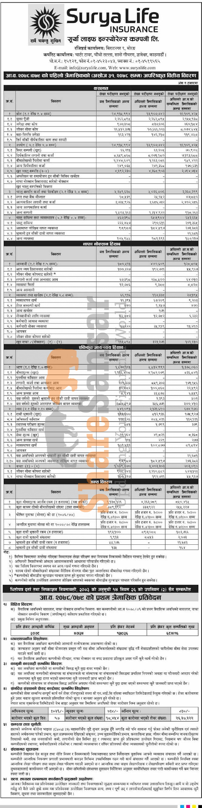 Surya Life Insurance Company Limited has posted a net profit of Rs 113.59 million and published its 1st quarter company analysis of the fiscal year 2078/79.