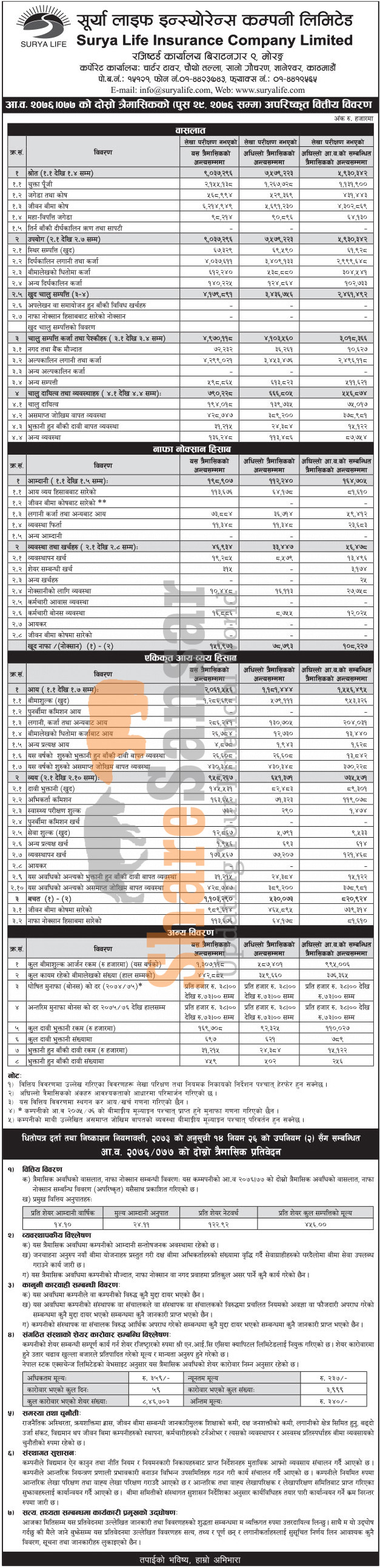 Surya Life Insurance Company Limited has posted a net profit of Rs 151.97 million and published its 2nd quarter company analysis of the fiscal year 2076/77.