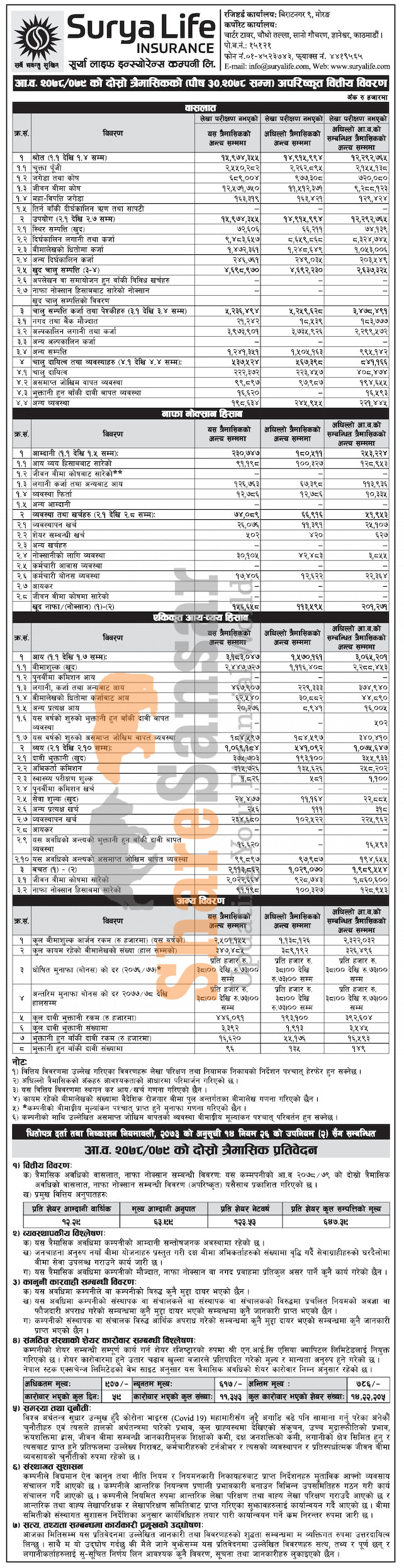 Surya Life Insurance Company Limited has posted a net profit of Rs 156.65 million and published its 2nd quarter company analysis of the fiscal year 2078/79.