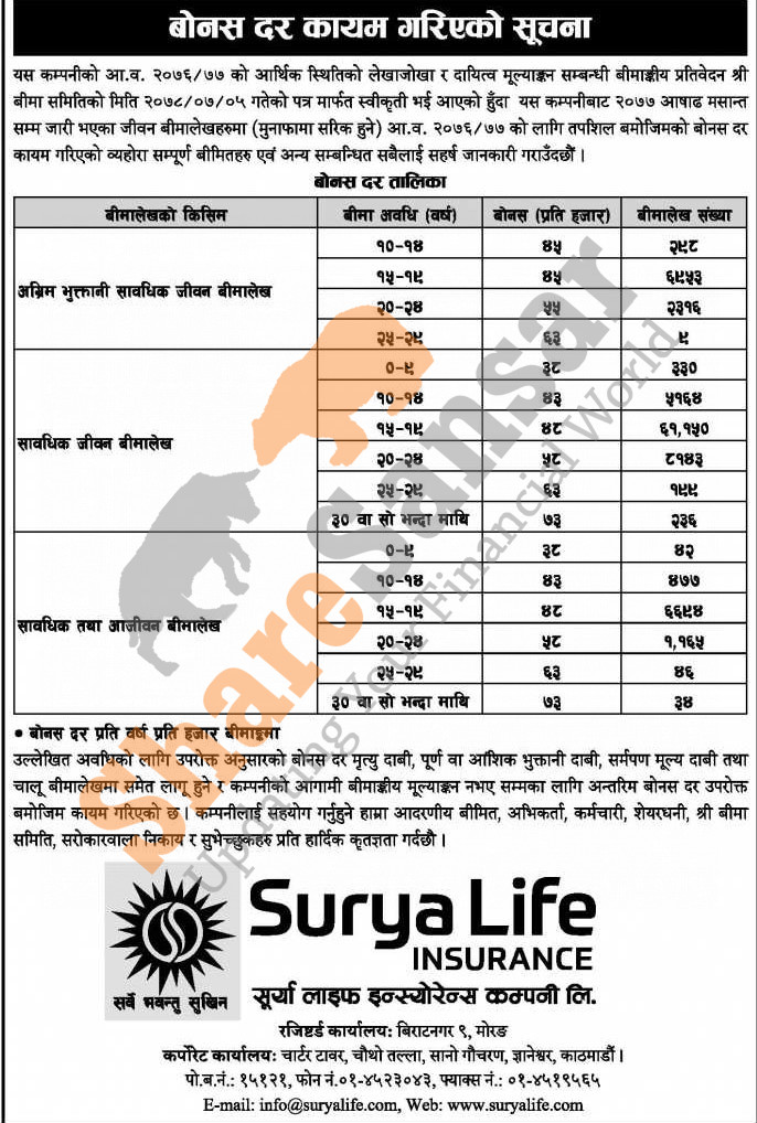 Surya Life Insurance Company Limited has published a notice regarding a new bonus rate for its different life insurance policies.