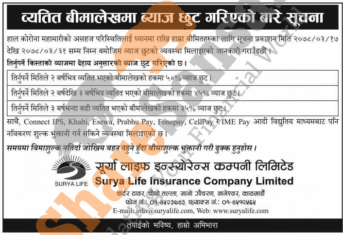 Surya Life Insurance Company Limited has published a notice to give an interest discount on its different past insurance policies from 17th Ashar to 31st Ashar,2078.
