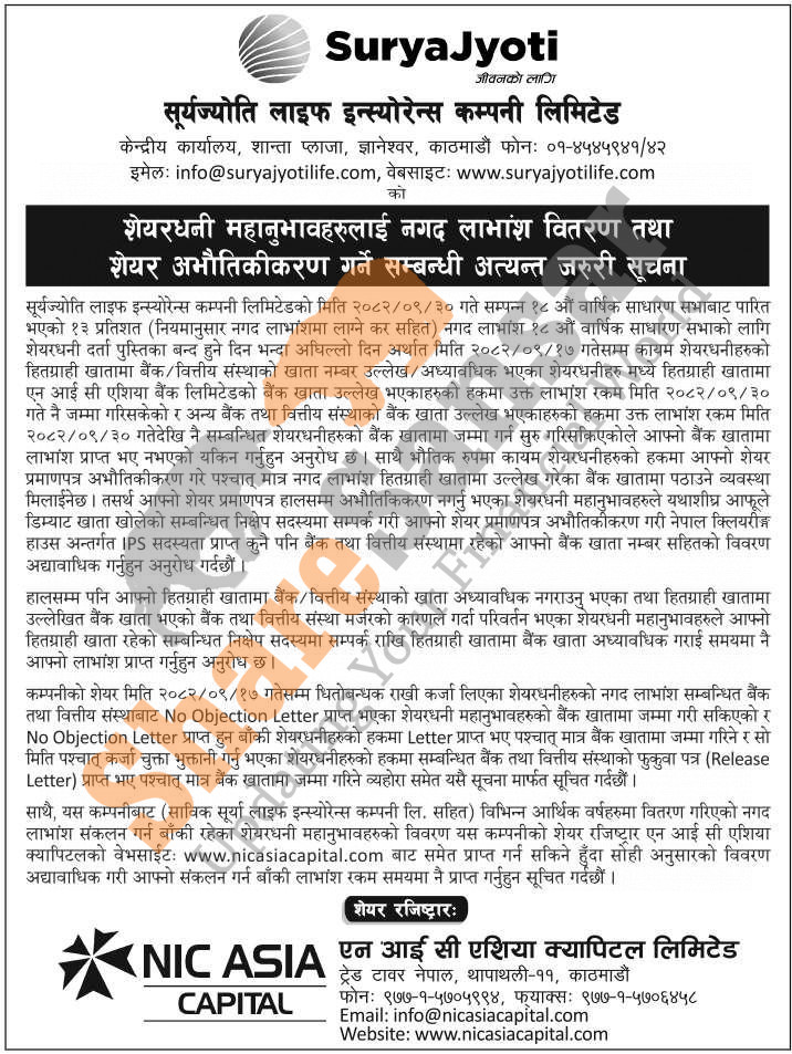 SuryaJyoti Life Insurance Company Limited has distributed 13% cash dividend directly to the bank accounts of its shareholders on 30th Poush, 2082 and has urged to dematerialize their bank accounts.