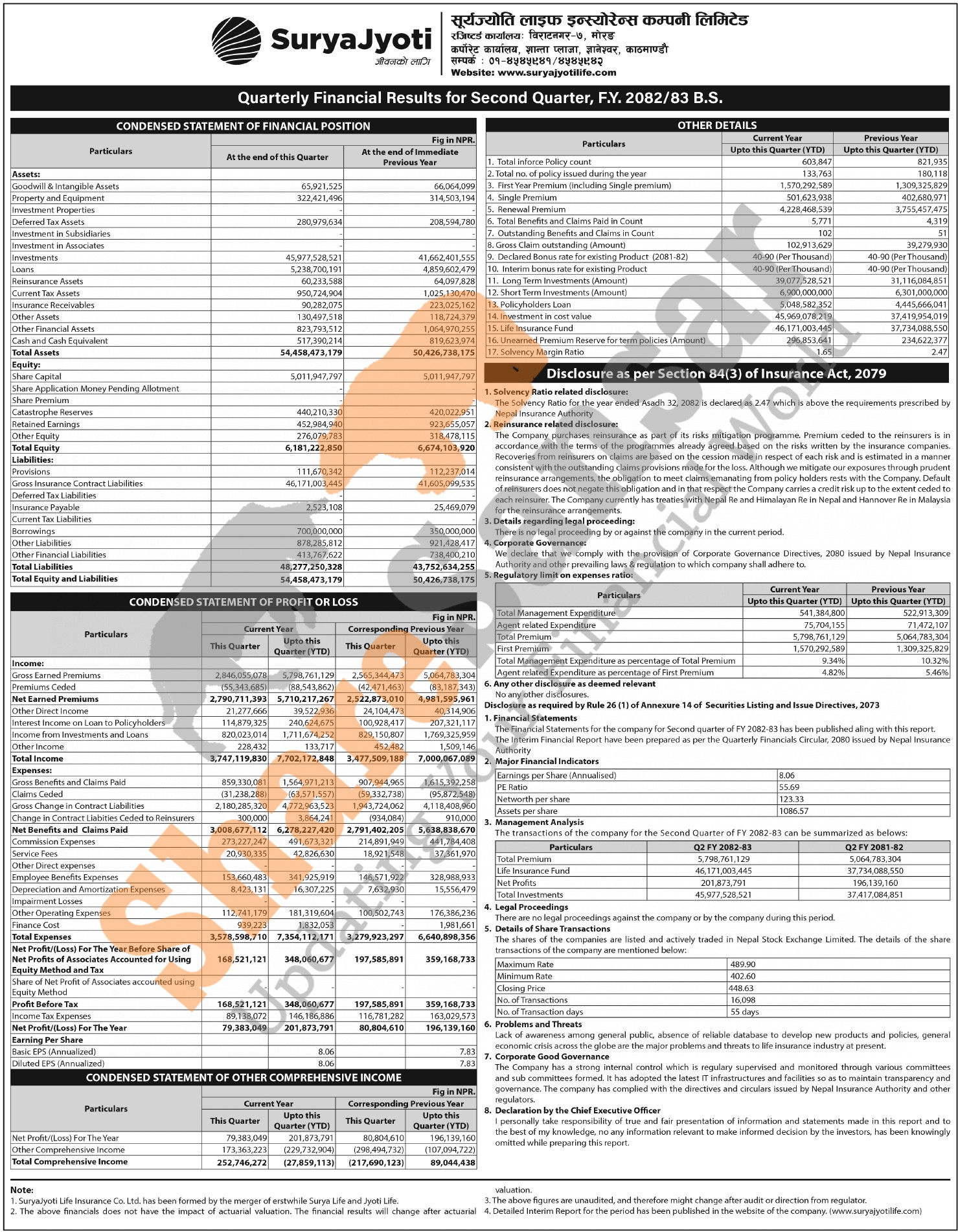SuryaJyoti Life Insurance Company Limited has posted a net profit of Rs 201.87 million and published its 2nd quarter company analysis of the fiscal year 2082/83.