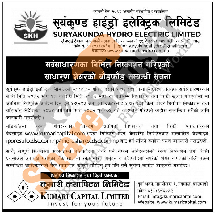 Suryakunda Hydro Electric Limited has allotted its 5,72,431 units IPO shares to the general public on 5th Falgun, 2082.