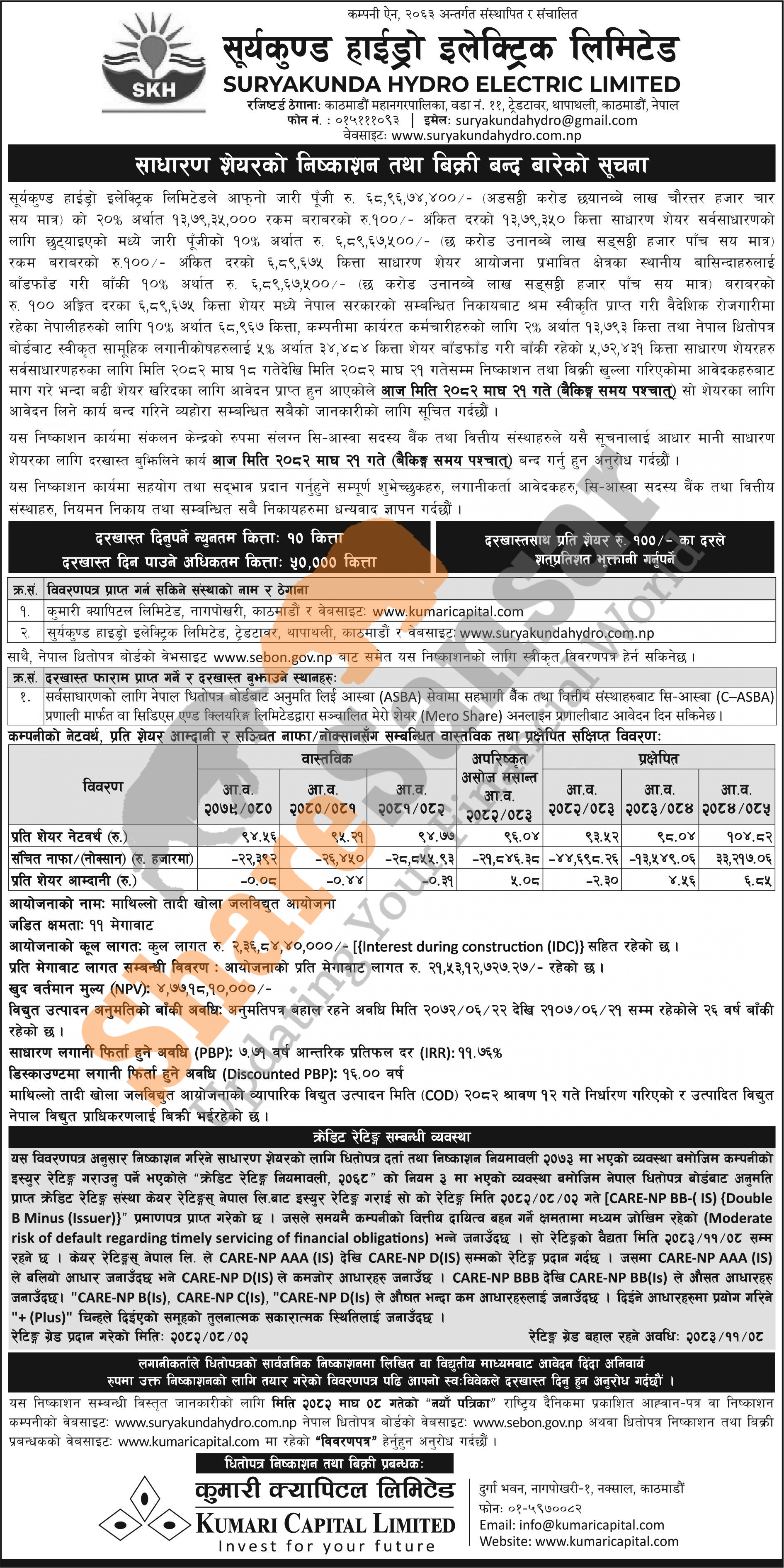 Suryakunda Hydro Electric Limited is closing its 5,72,431 units IPO shares to the general public from today (21st Magh, 2082).