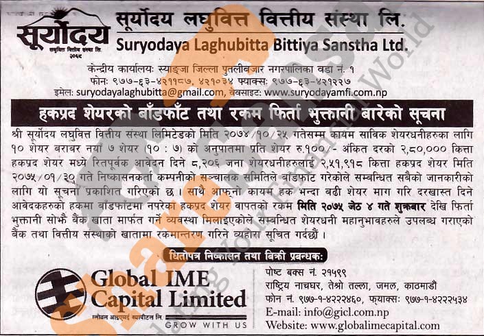 Suryodaya Laghubitta Bittiya Sanstha Limited has allotted its 10:7 ratio 2,80,000 units right share to its shareholders on 30th Baishak, 2075 and refunding money to non-allottee from 4th Jestha, 2075.