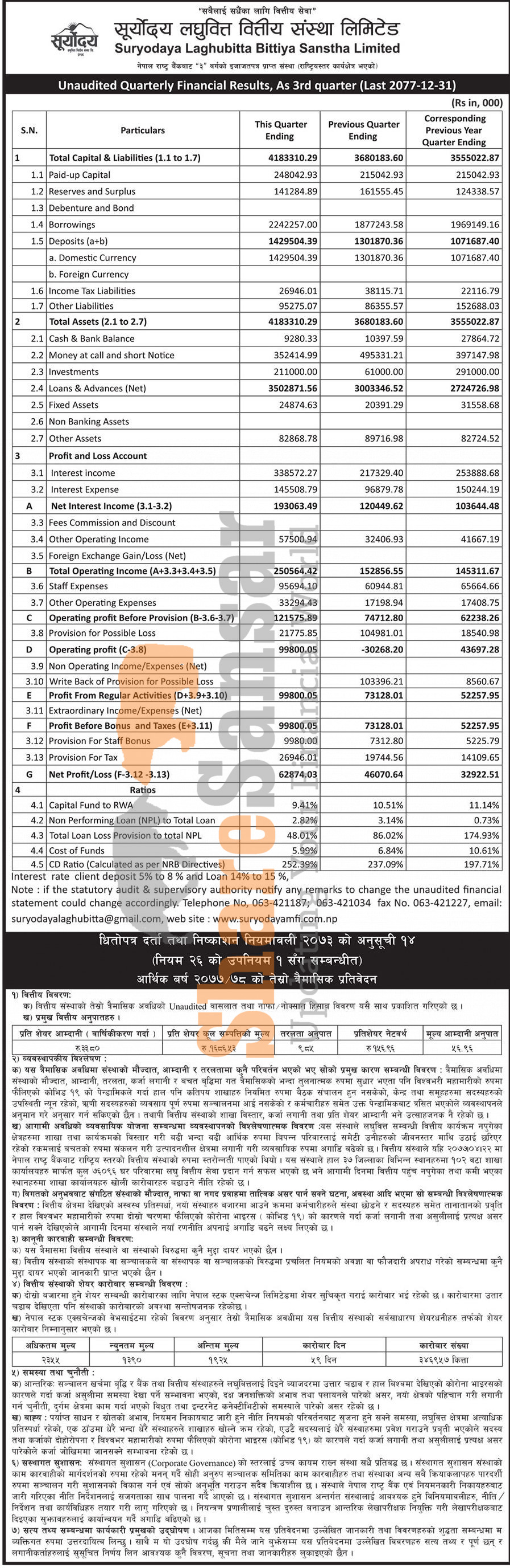 Suryodaya Laghubitta Bittiya Sanstha Limited has posted a net profit of Rs 62.87 million and published its 3rd quarter company analysis of the fiscal year 2077/78.