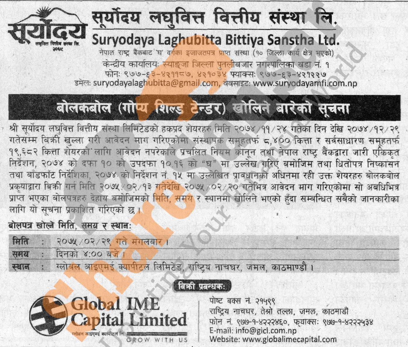 Suryodaya Laghubitta Bittiya Sanstha Limited has published a notice regarding bid opening date of 8,400 units promoter share and 19,682 units ordinary share in auction to the general public on (29th Jestha, 2075).