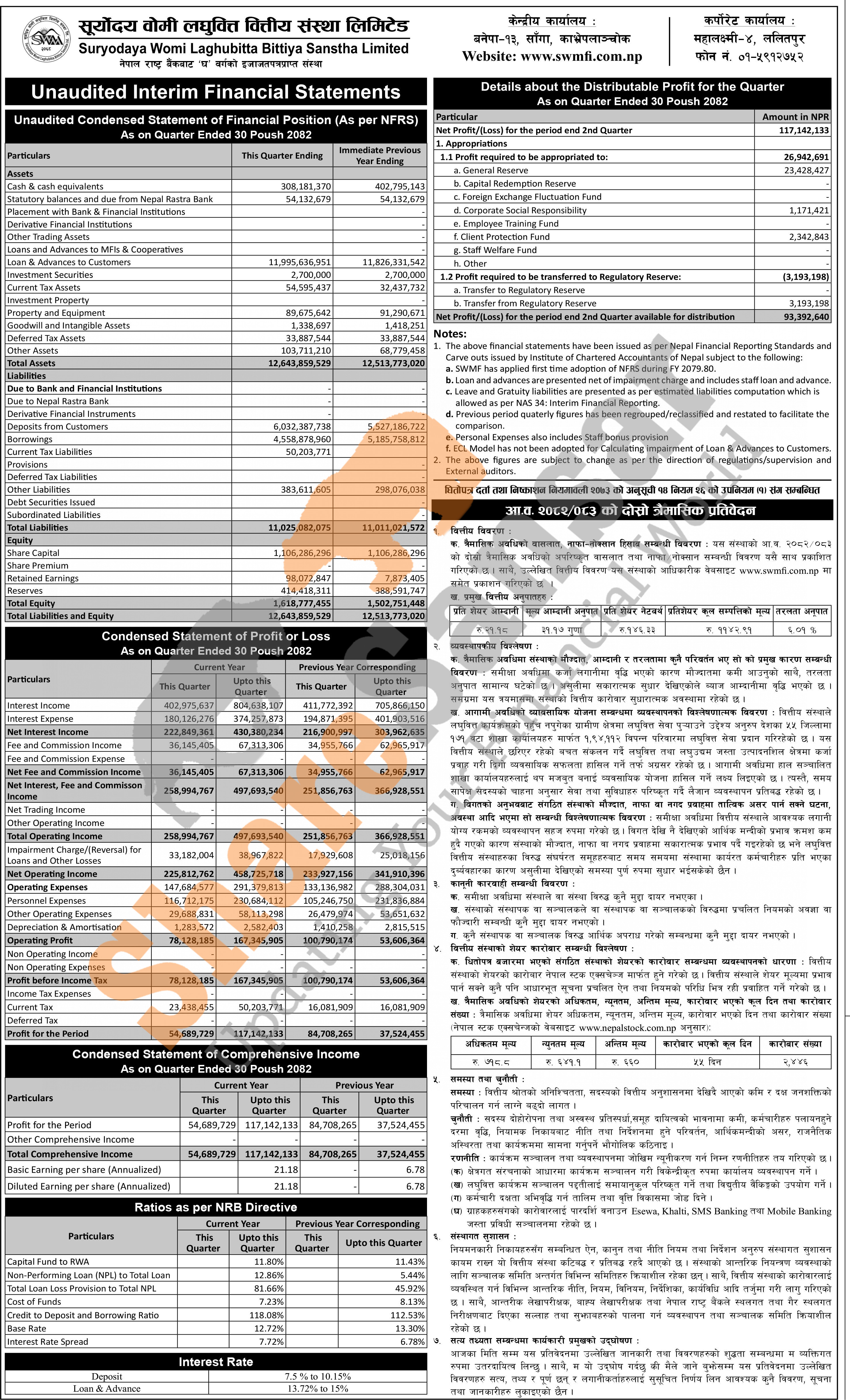 Suryodaya Womi Laghubitta Bittiya Sanstha Limited has posted a net profit of Rs 117.14 million and published its 2nd quarter company analysis of the fiscal year 2082/83.