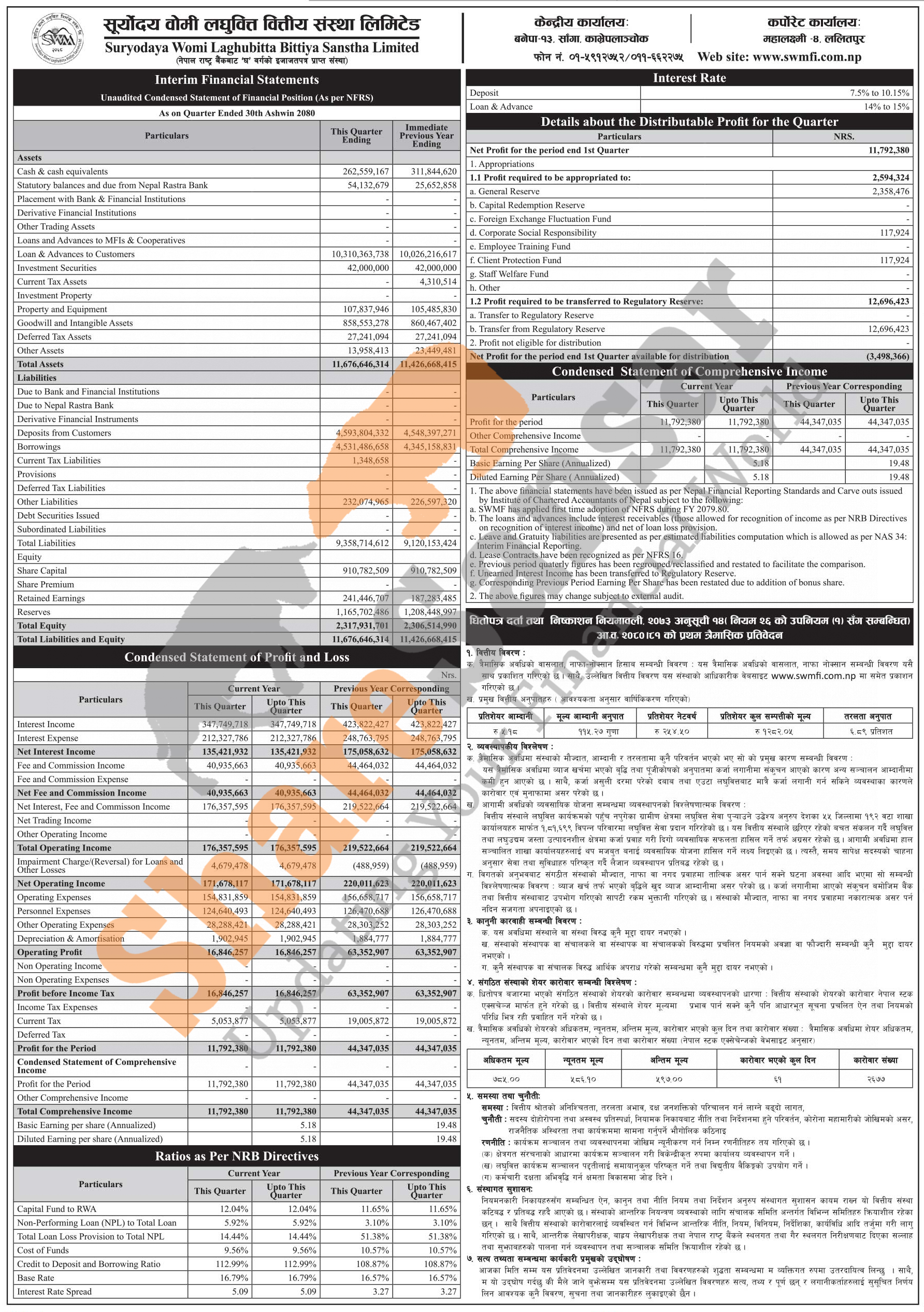 Suryodaya Womi Laghubitta Bittiya Sanstha Limited has posted a net profit of Rs 11.79 million and published its 1st quarter company analysis of the fiscal year 2080/81.