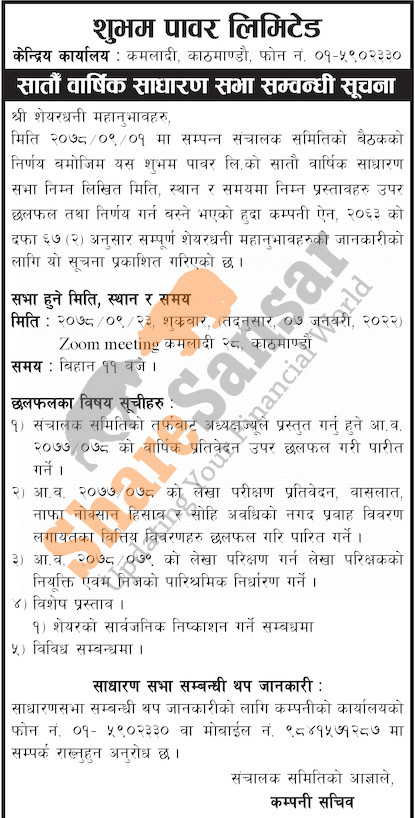 Suvam Power Limited has announced its 7th AGM going to be held on 23rd Poush, 2078.
