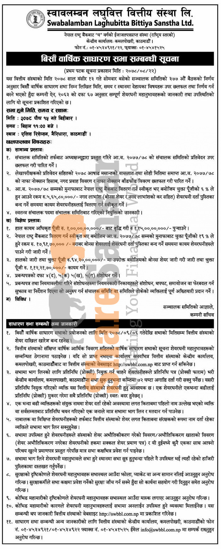 Swabalamban Laghubitta Bittiya Sanstha Limited has announced its 20th AGM going to be held on 15th Poush, 2078.