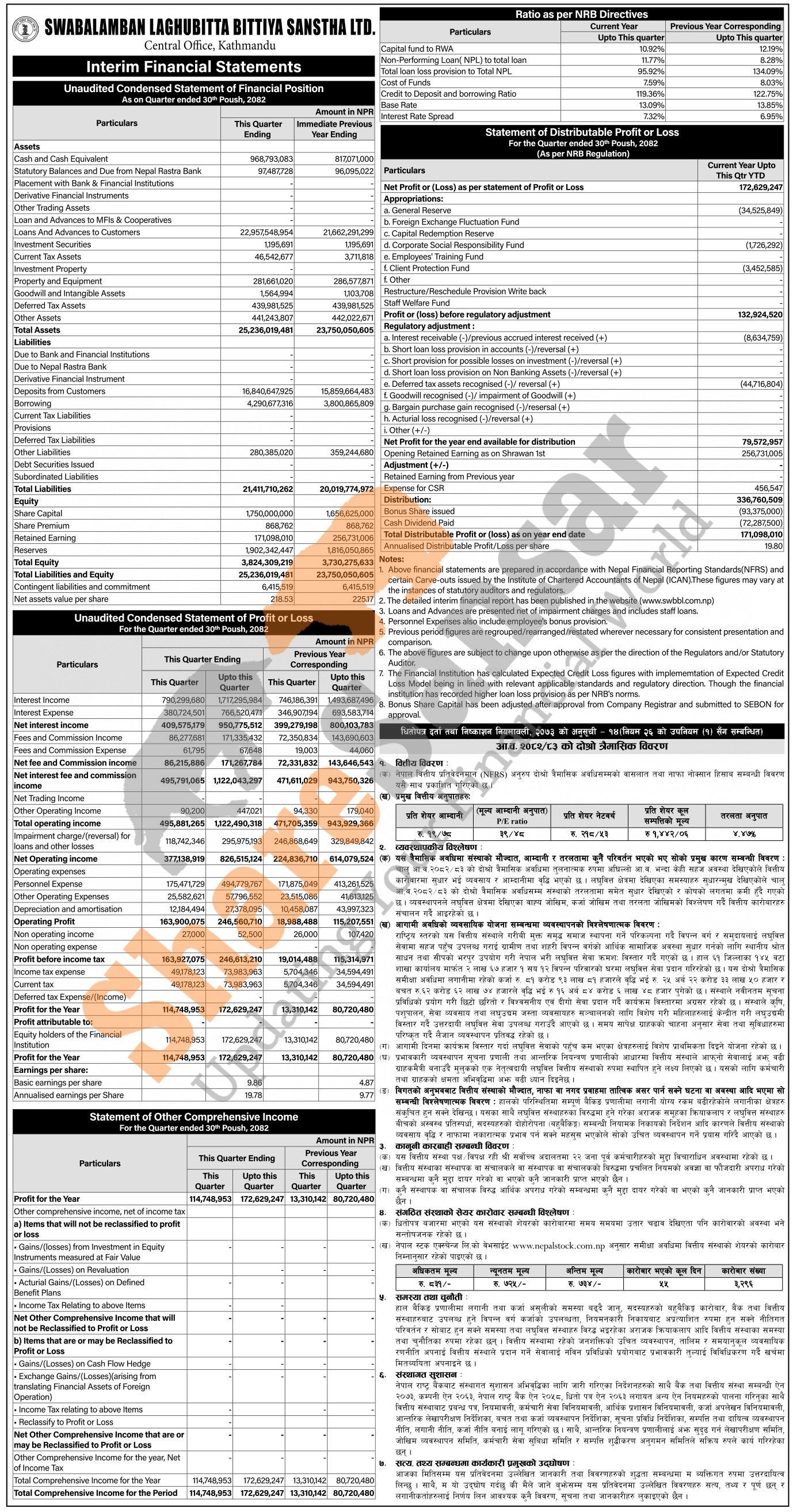 Swabalamban Laghubitta Bittiya Sanstha Limited has posted a net profit of Rs 172.62 million and published its 2nd quarter company analysis of the fiscal year 2082/83.