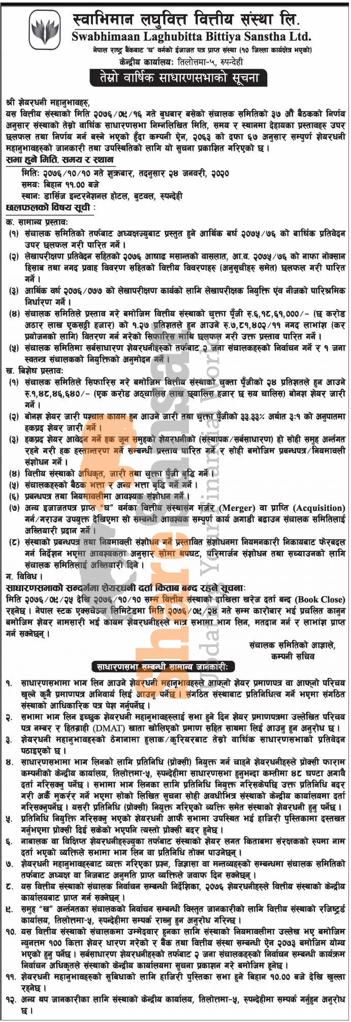 Swabhimaan Laghubitta Bittiya Sanstha Limited has announced its 3rd AGM going to be held on 10th Magh, 2076.