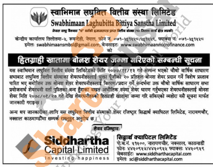 Swabhimaan Laghubitta Bittiya Sanstha Limited has distributed 20% bonus shares directly to DEMAT accounts of its shareholders and has urged to dematerialize their shares.
