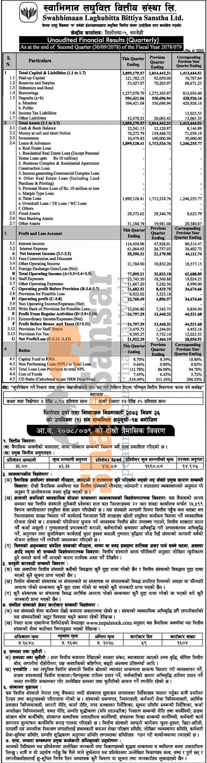 Swabhimaan Laghubitta Bittiya Sanstha Limited has posted a net profit of Rs 21.92 million and published its 2nd quarter company analysis of the fiscal year 2078/79.