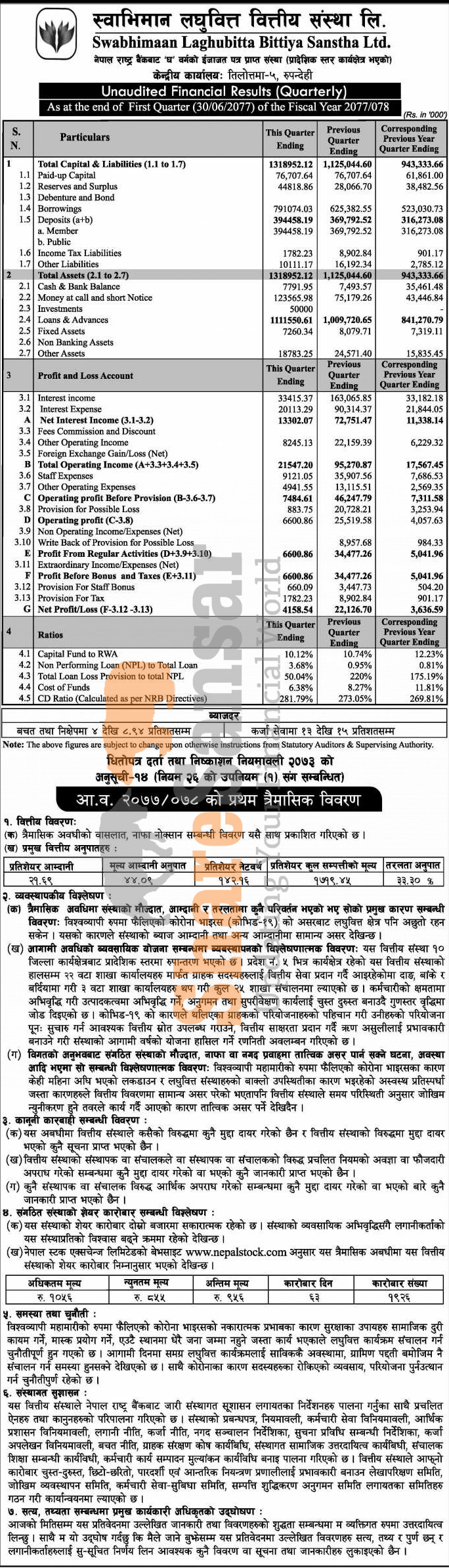 Swabhimaan Laghubitta Bittiya Sanstha Limited has posted a net profit of Rs 4.15 million and published its 1st quarter company analysis of the fiscal year 2077/78.