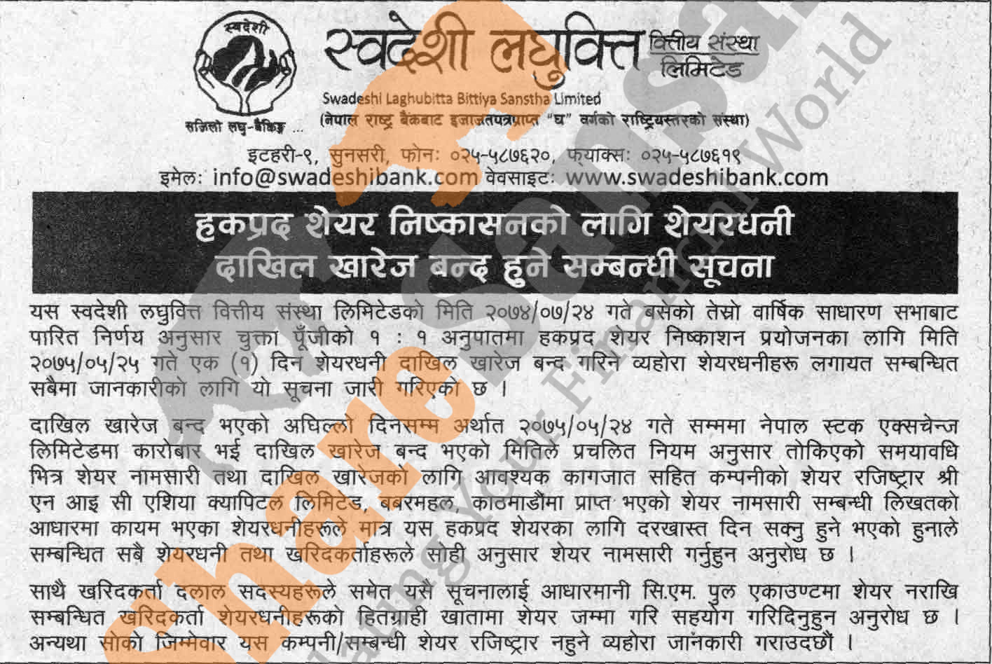 Swadeshi Laghubitta Bittiya Sanstha Limited has announced a book closure date for its upcoming 1:1 ratio right share on 25th Bhadra, 2075.