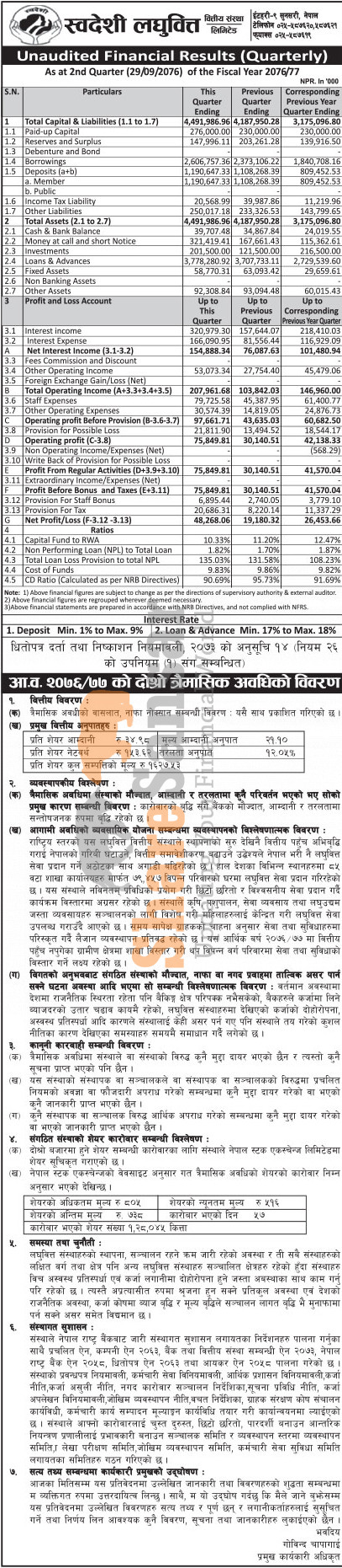 Swadeshi Laghubitta Bittiya Sanstha Limited has posted a net profit of Rs 48.26 million and published its 2nd quarter company analysis of the fiscal year 2076/77.