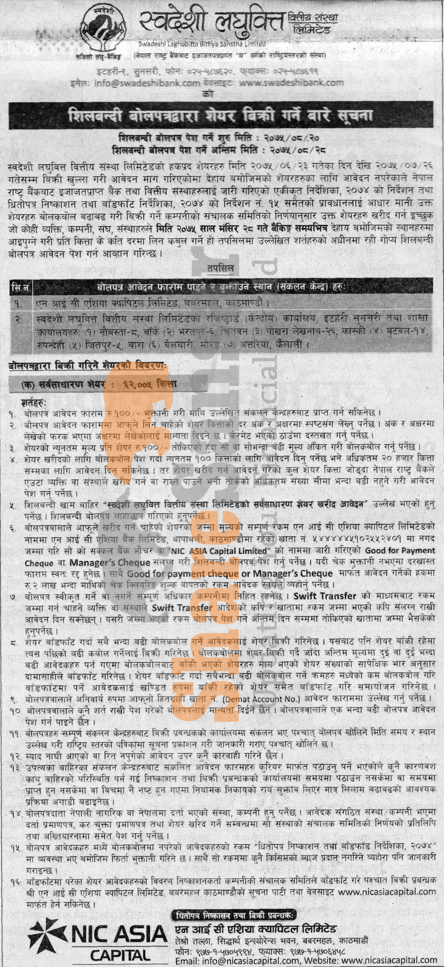 Swadeshi Laghubitta Bittiya Sanstha Limited is selling its 62,005 unit ordinary shares in auction to the general public from (20th to 28th Mangsir, 2075).