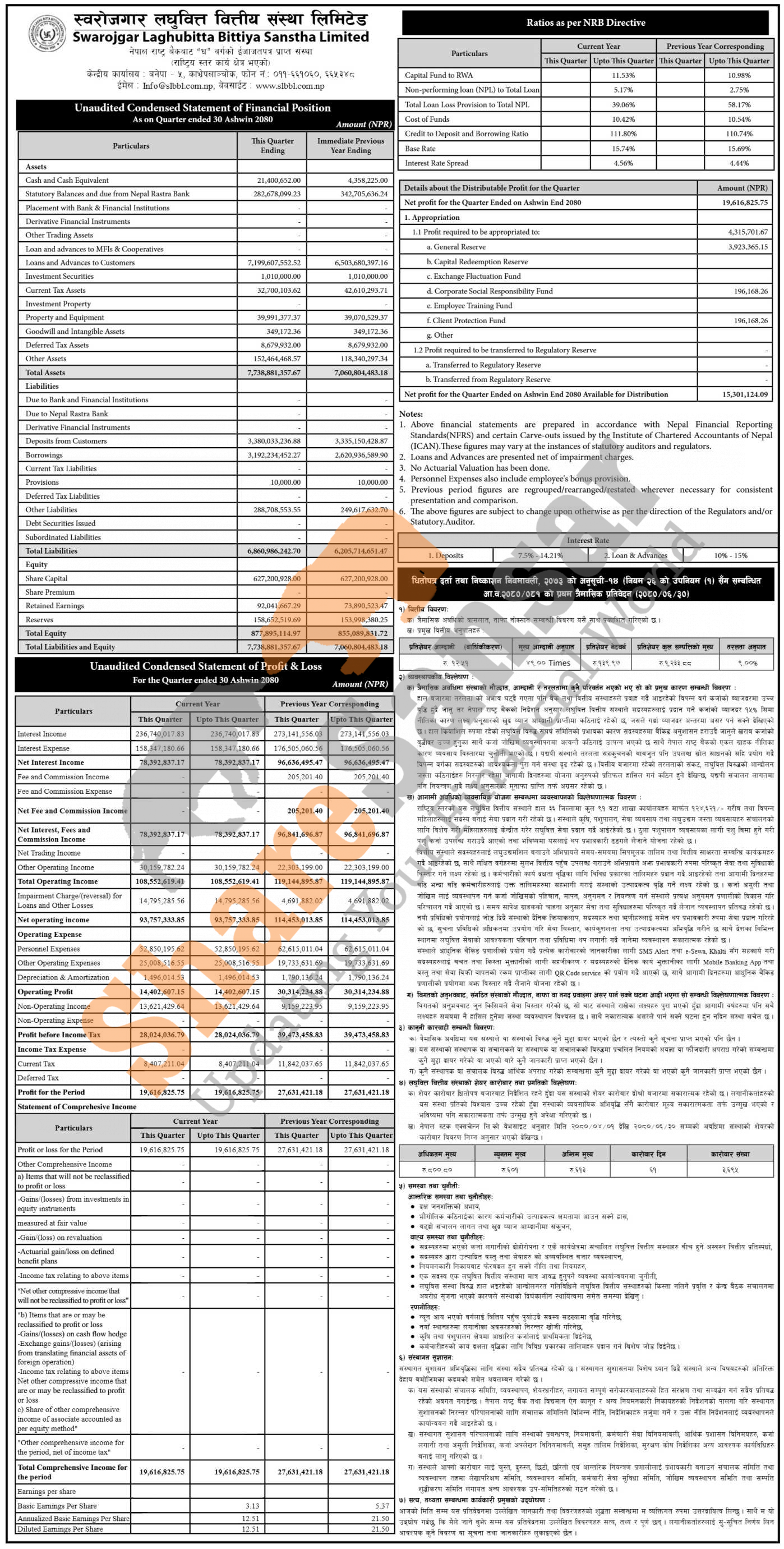 Swarojgar Laghubitta Bittiya Sanstha Limited has posted a net profit of Rs 19.61 million and published its 1st quarter company analysis of the fiscal year 2080/81.