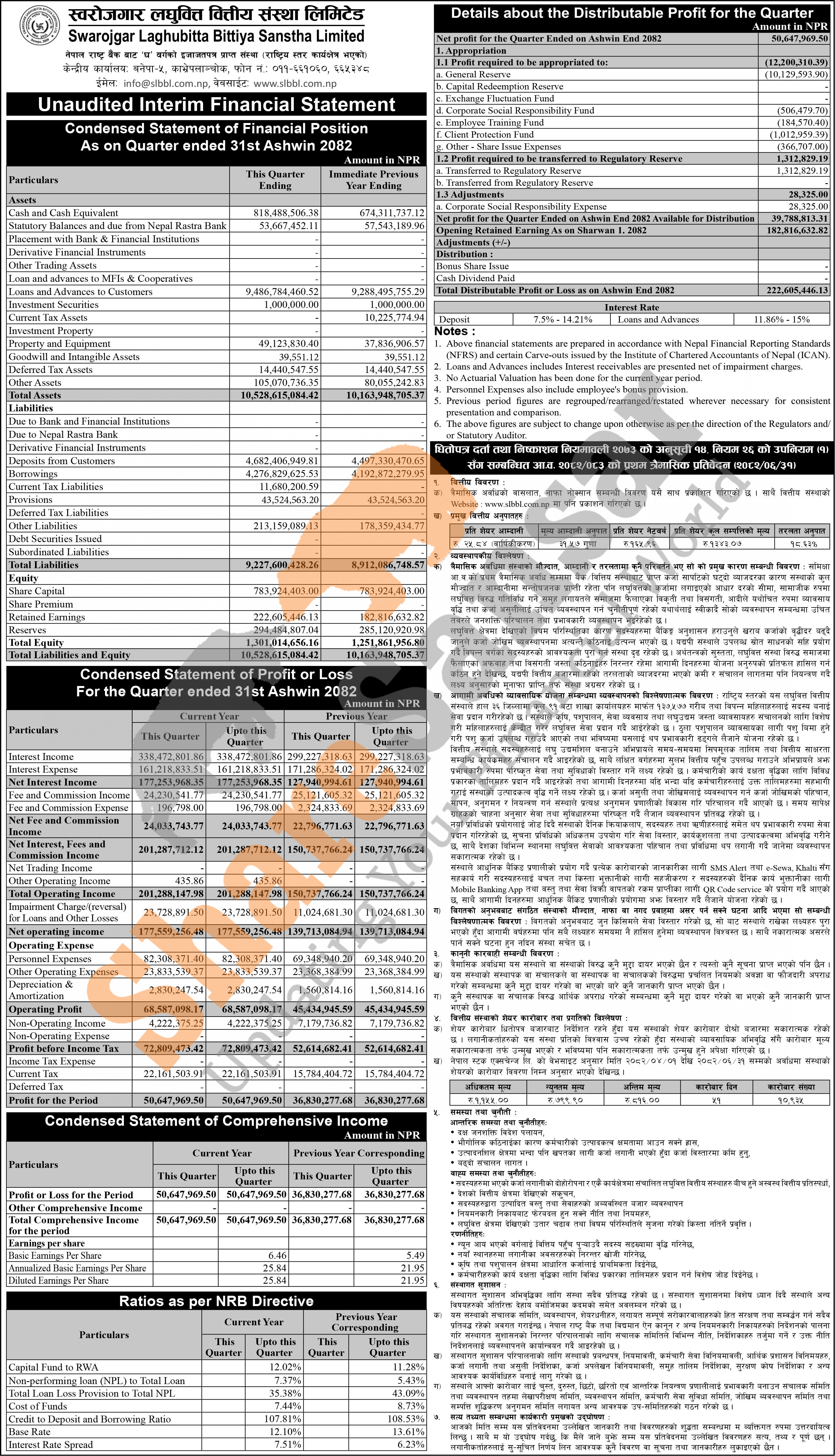 Swarojgar Laghubitta Bittiya Sanstha Limited has posted a net profit of Rs 50.64 million and published its 1st quarter company analysis of the fiscal year 2082/83.