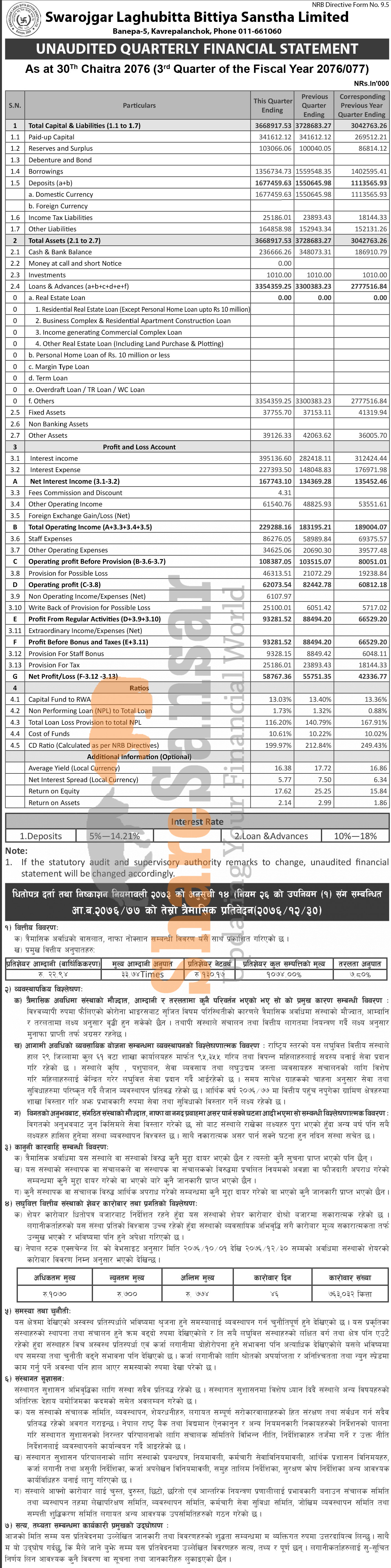 Swarojgar Laghubitta Bittiya Sanstha Limited has posted a net profit of Rs 58.76 million and published its 3rd quarter company analysis of the fiscal year 2076/77.