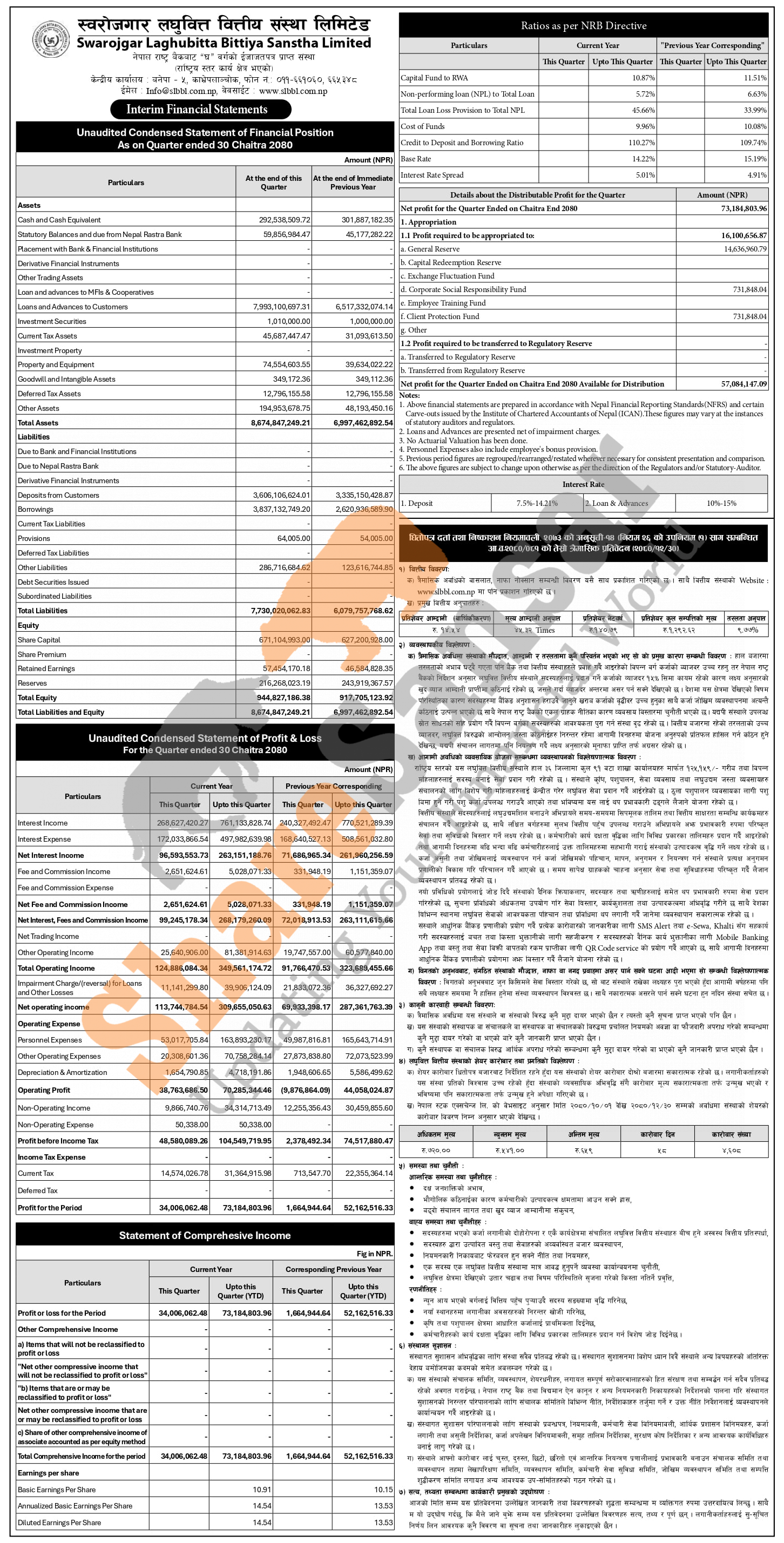Swarojgar Laghubitta Bittiya Sanstha Limited has posted a net profit of Rs 73.18 million and published its 3rd quarter company analysis of the fiscal year 2080/81.