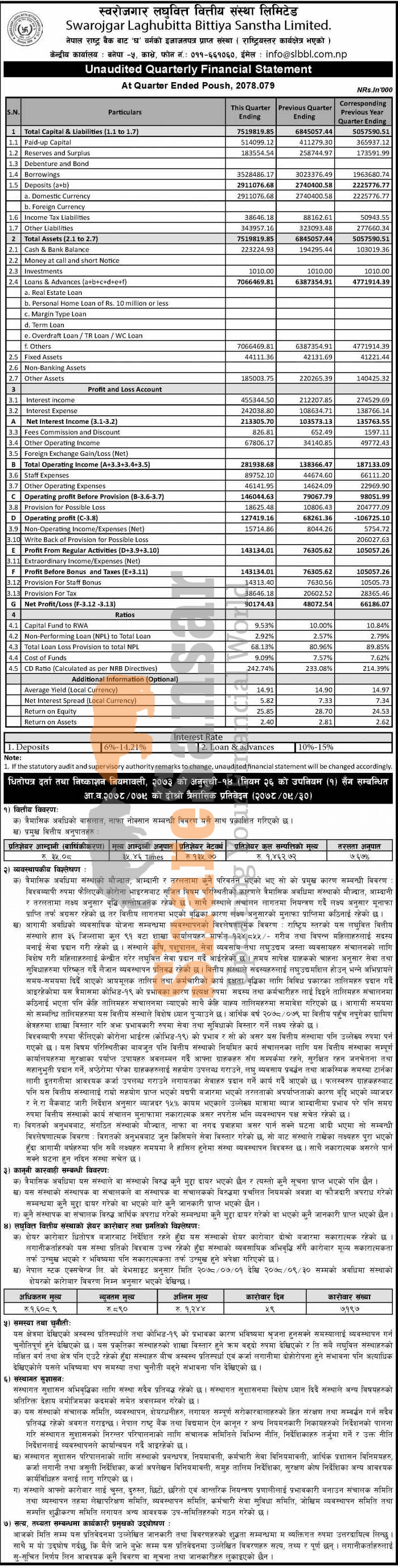 Swarojgar Laghubitta Bittiya Sanstha Limited has posted a net profit of Rs 90.17 million and published its 2nd quarter company analysis of the fiscal year 2078/79.