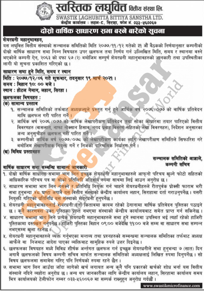 Swastik Laghubitta Bittiya Sanstha Limited has announced its 2nd AGM going to be held on Chaitra 6, 2077.