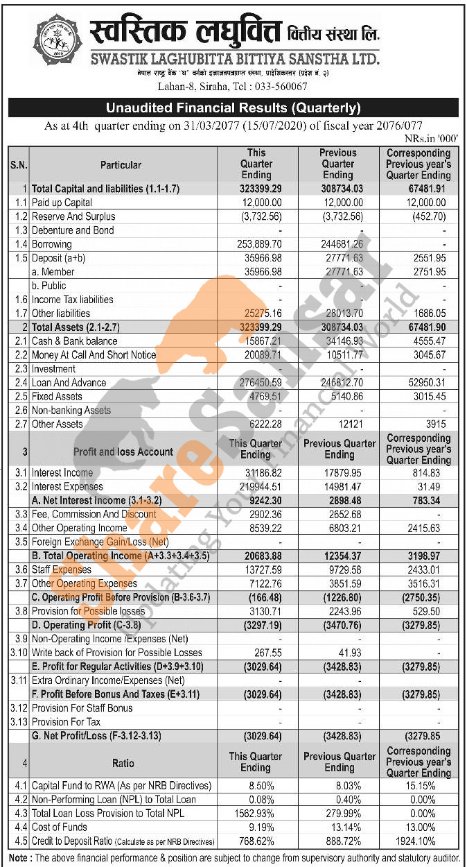 Swastik Laghubitta Bittiya Sanstha Limited has posted a net loss of Rs 3.02 million during the 4th quarter of the fiscal year 2076/77.