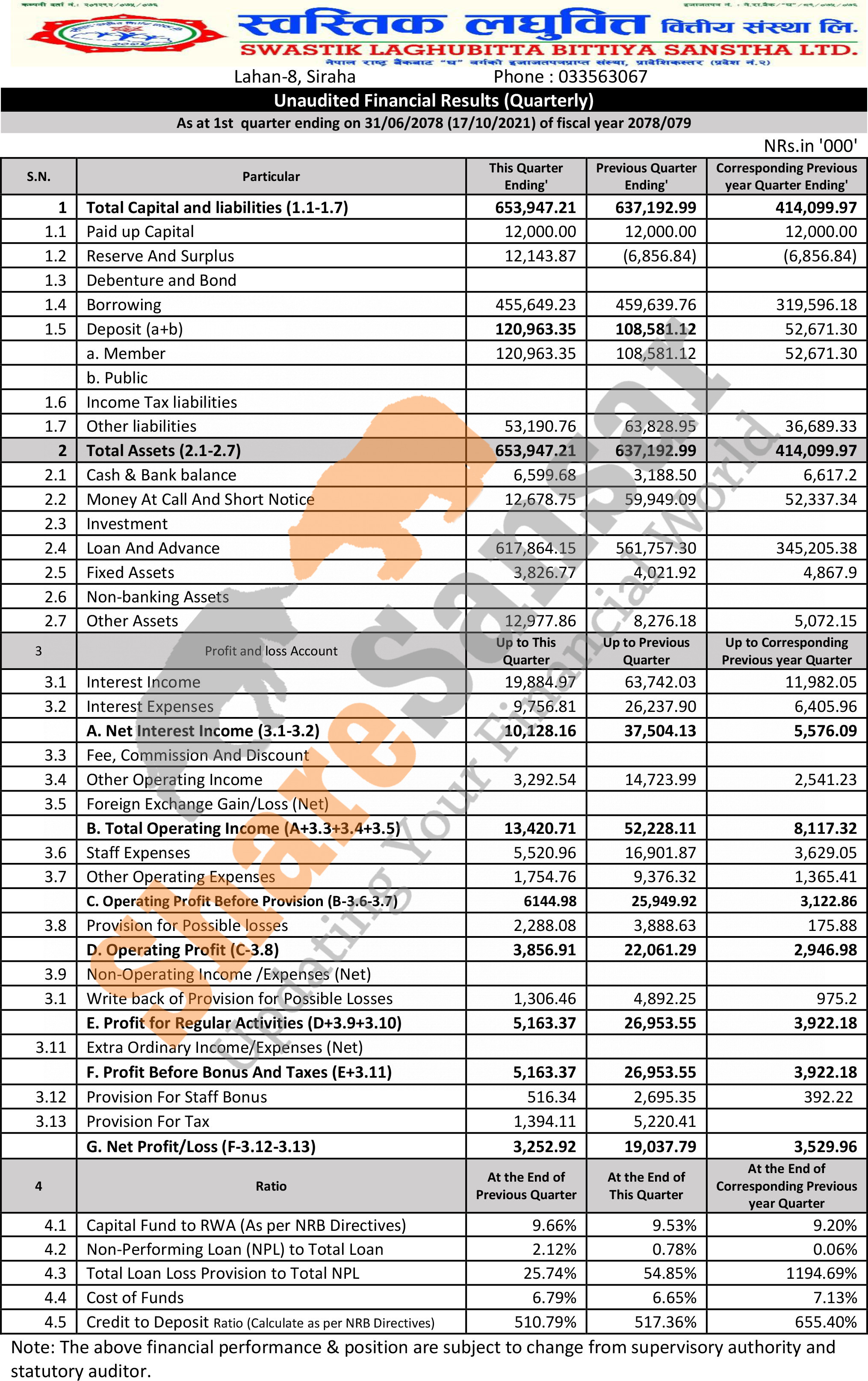 Swastik Laghubitta Bittiya Sanstha Limited has posted a net profit of Rs 3.25 million and published its 1st quarter company analysis of the fiscal year 2078/79.