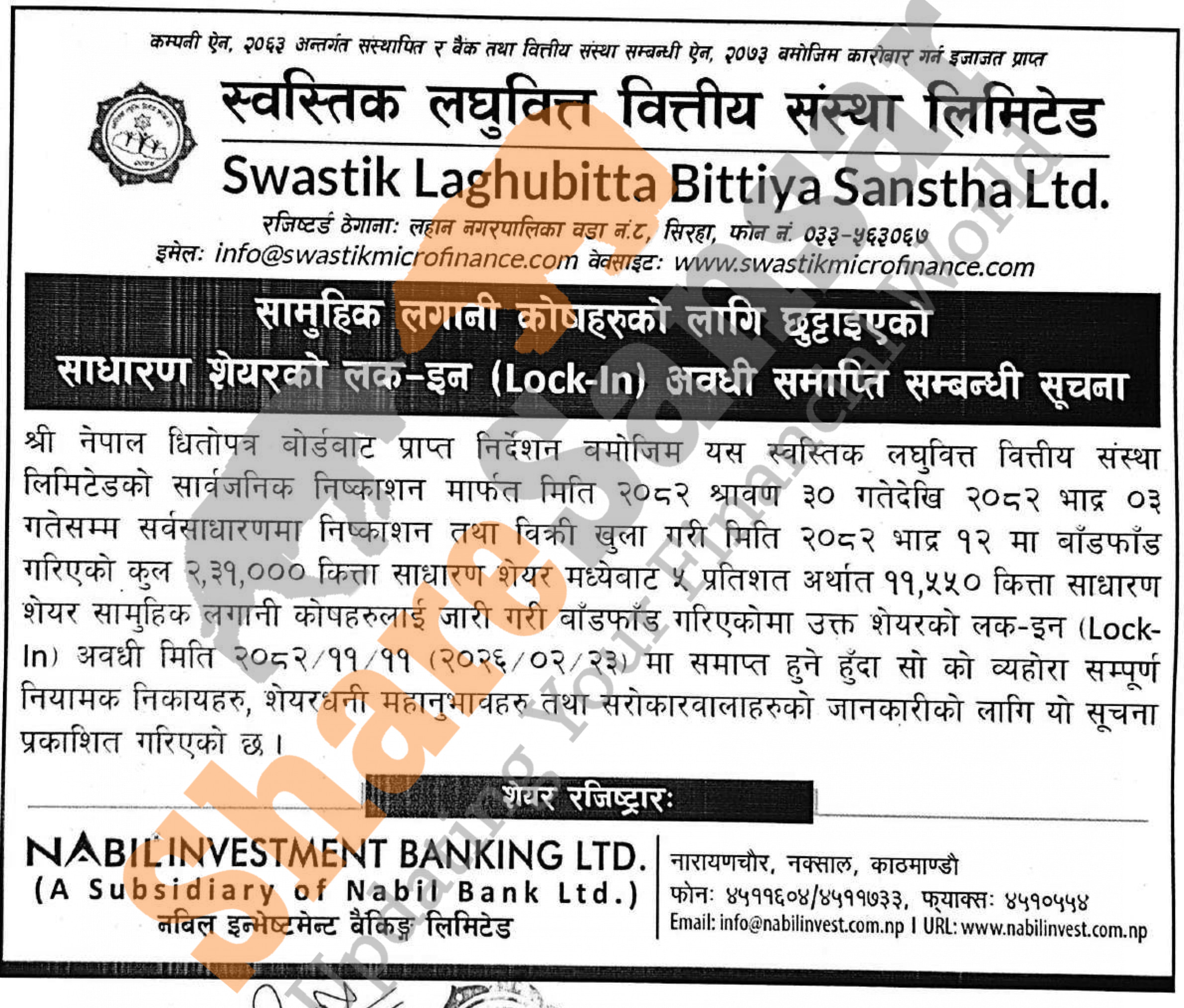 Swastik Laghubitta Bittiya Sanstha Limited has published a notice regarding the expiration of the lock-in period of Mutual Fund for all investors and stakeholders on 11th Falgun, 2082.