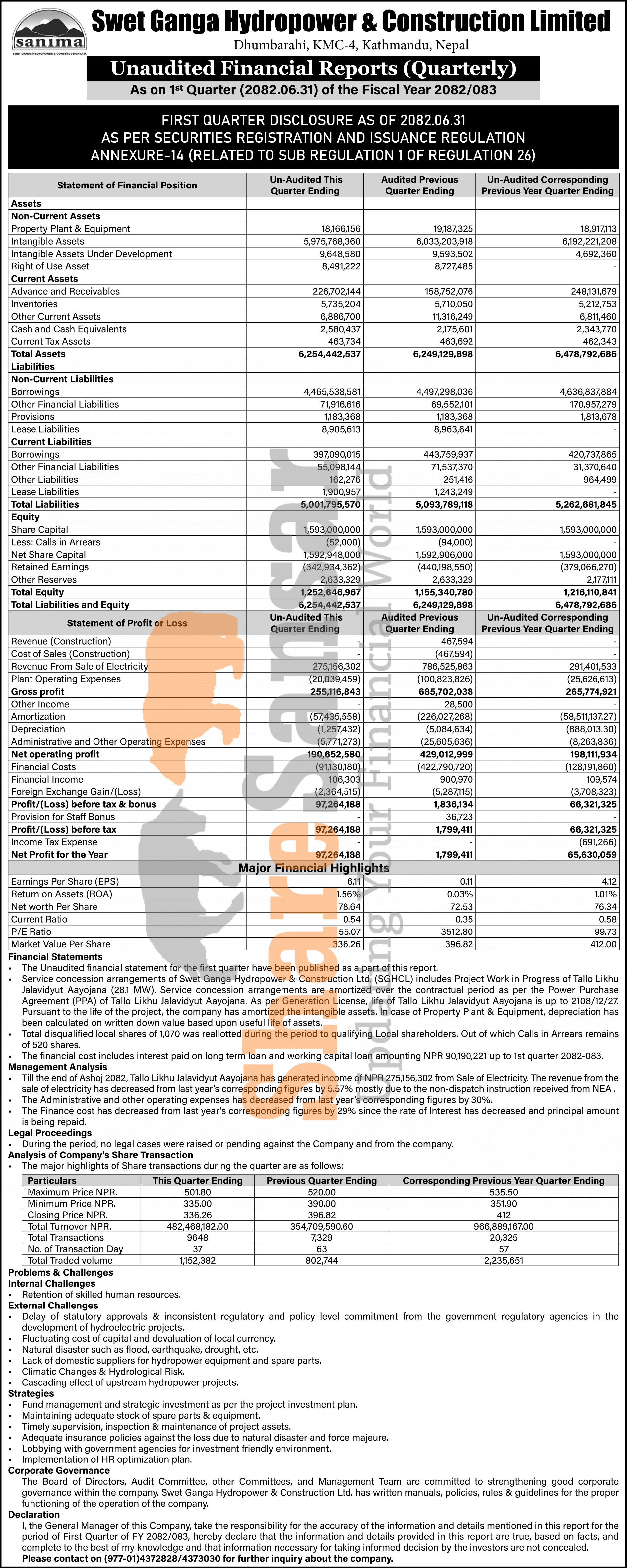 Swet-Ganga Hydropower & Construction Limited has posted a net profit of Rs 97.26 million and published its 1st quarter company analysis of the fiscal year 2082/83.
