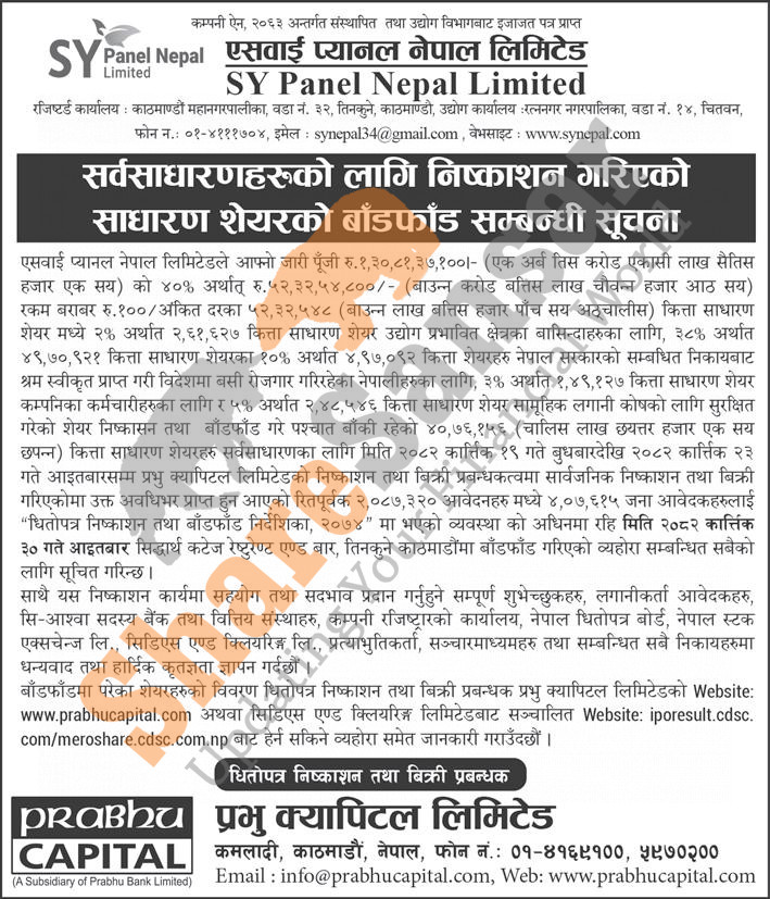 SY Panel Nepal Limited has allotted its 40,76,156 units IPO shares to the general public on 30th Kartik, 2082.