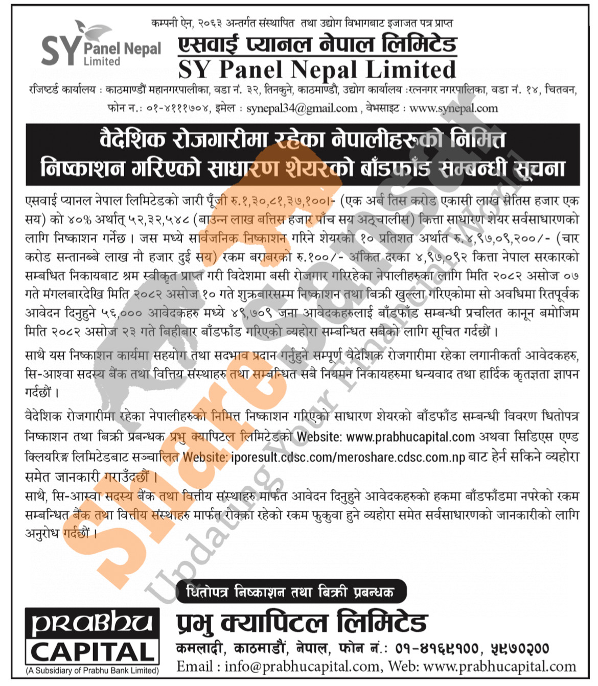 SY Panel Nepal Limited has allotted its 4,97,092 units IPO Shares to Foreign Nepalese Employees on 23rd Ashwin, 2082.