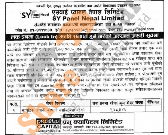 SY Panel Nepal Limited has published a notice regarding the expiration of the lock-in period of Mutual Fund for all investors and stakeholders on 29th Baisakh, 2083.