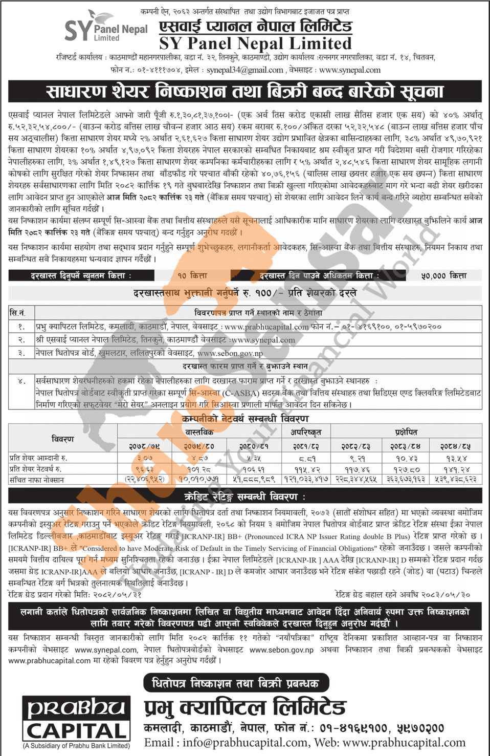 SY Panel Nepal Limited is closing its 40,76,156 units IPO shares to the general public from today (23rd Kartik, 2082).