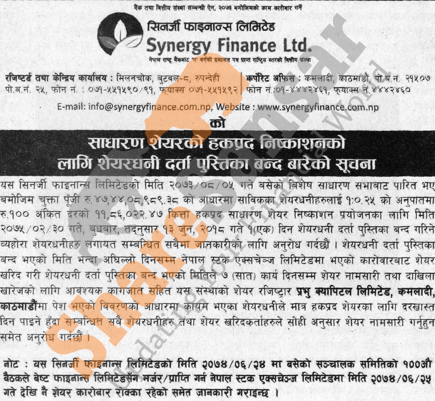 Synergy Finance Limited has announced a book closure date for its upcoming 1:0.25 ratio right share on 30th Jestha, 2075.