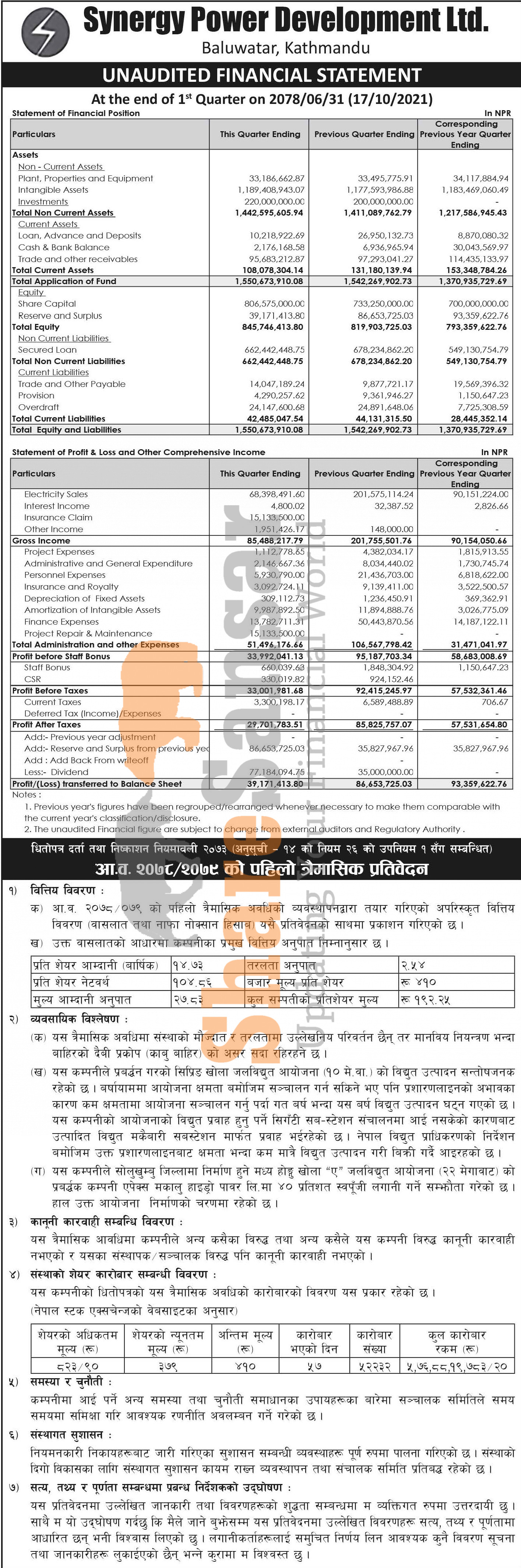 Synergy Power Development Limited has posted a net profit of Rs 29.70 million and published its 1st quarter company analysis of the fiscal year 2078/79.