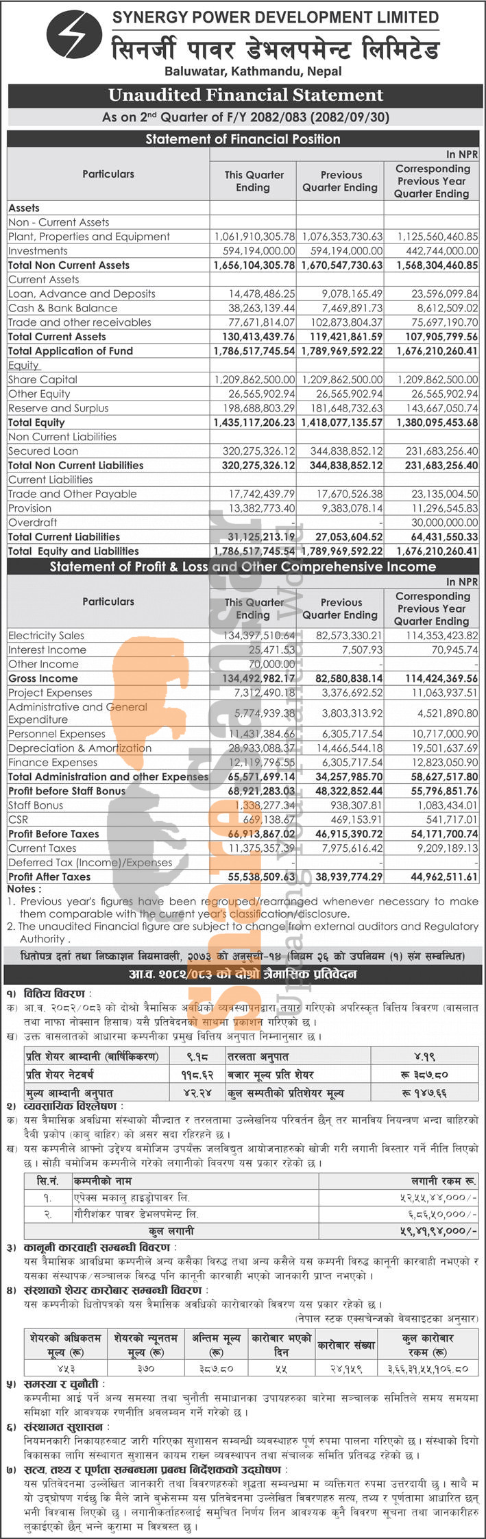 Synergy Power Development Limited has posted a net profit of Rs 55.53 million and published its 2nd quarter company analysis of the fiscal year 2082/83.