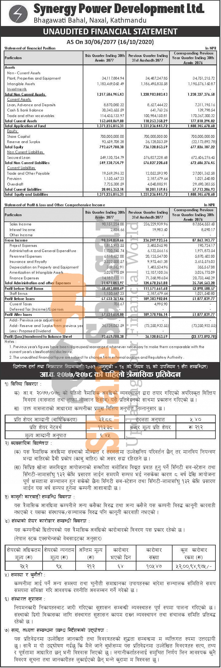 Synergy Power Development Limited has posted a net profit of Rs 57.53 million and published its 1st quarter company analysis of the fiscal year 2077/78.