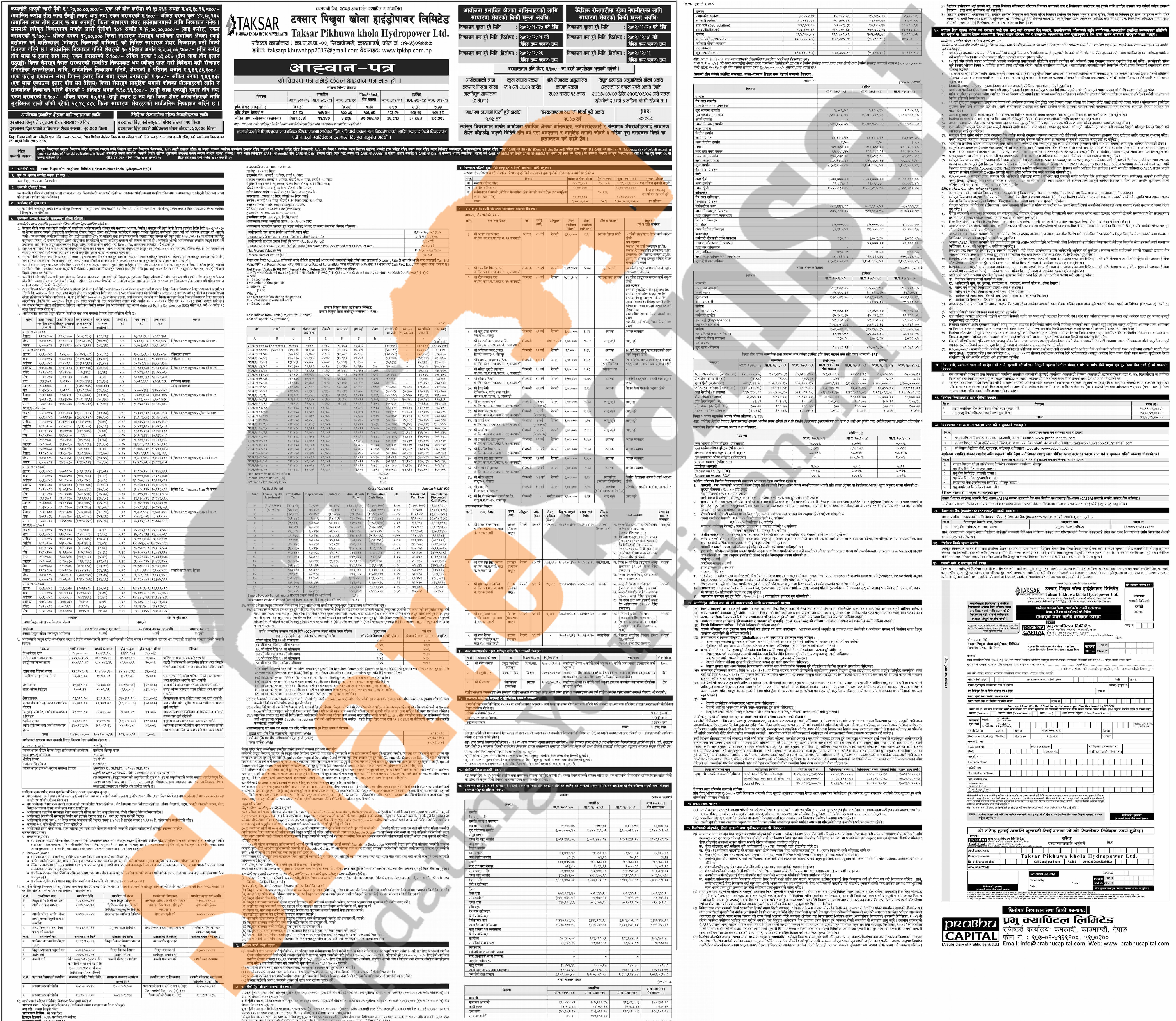 Taksar Pikhuwa Khola Hydropower Limited has published an offer letter to issue 12,00,000 units IPO shares to the project-affected locals of Bhojpur District from 27th Falgun to 11th Chaitra, 2082.