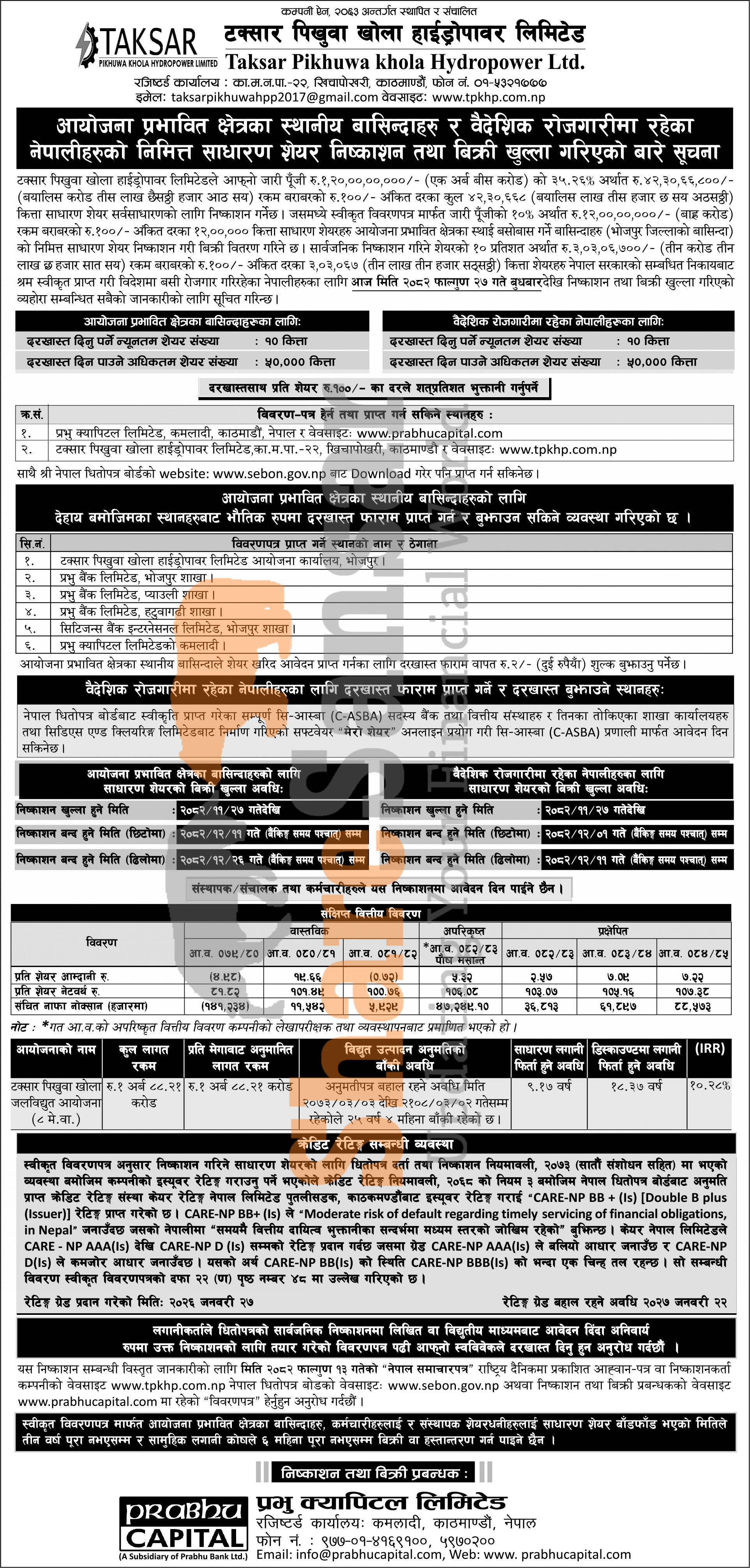 Taksar Pikhuwa Khola Hydropower Limited is opening its 12,00,000 units IPO shares to the project-affected locals of Bhojpur District and 3,03,067 units IPO Shares to Foreign Nepalese Employees from today (27th Falgun, 2082).