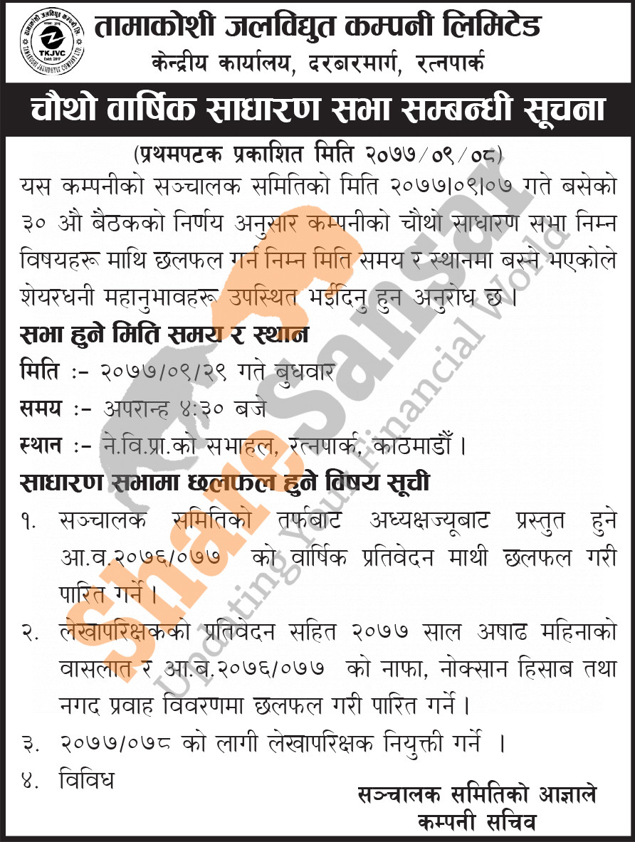 Tamakoshi Jalvidhyut Company Limited has announced its 4th AGM going to be held on 29th Poush, 2077.