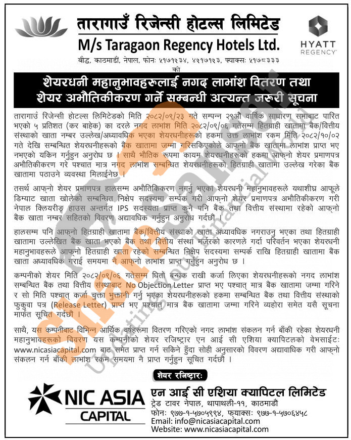 Taragaon Regency Hotel Limited has distributed 5% cash dividend directly to the bank account of its shareholders and urged to dematerialize their shares.