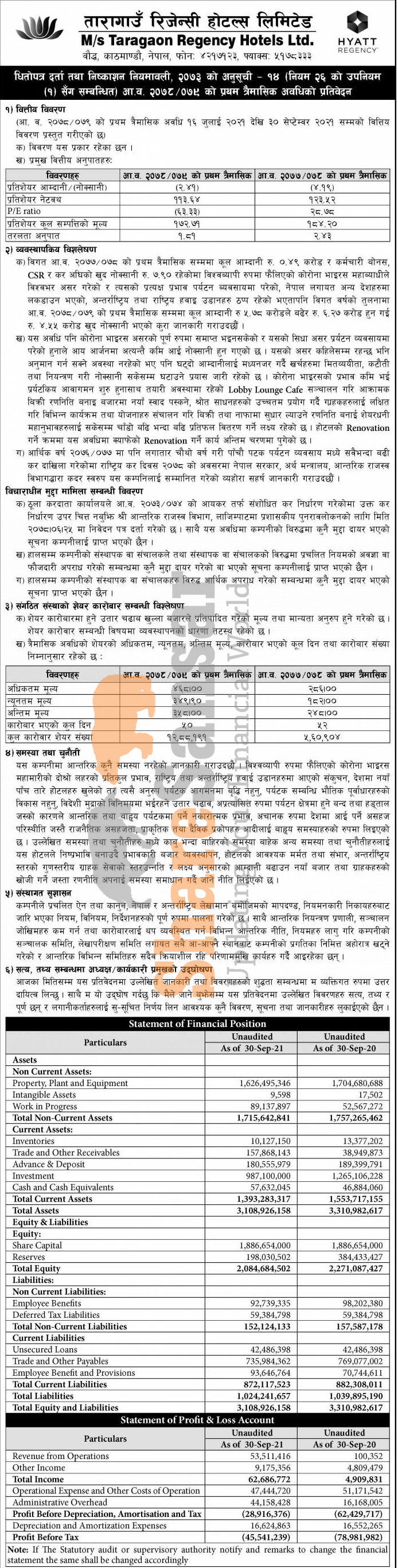 Taragaon Regency Hotels Limited has posted a net loss of Rs 45.54 million and published its 1st quarter company analysis of the fiscal year 2078/79.